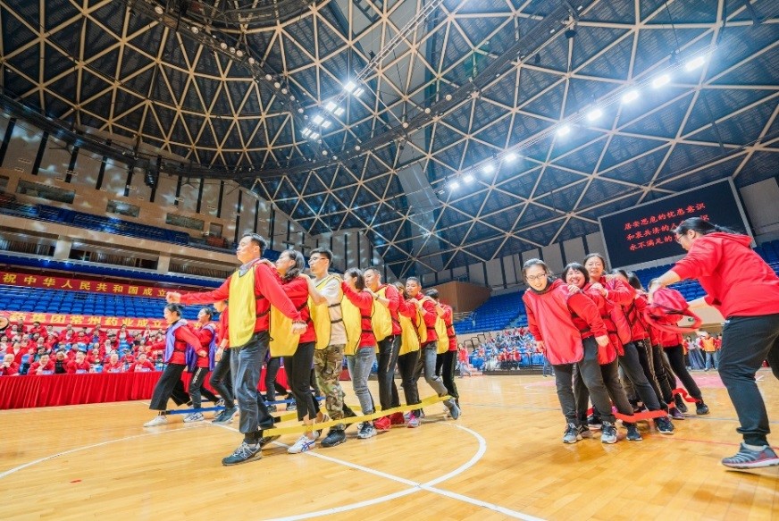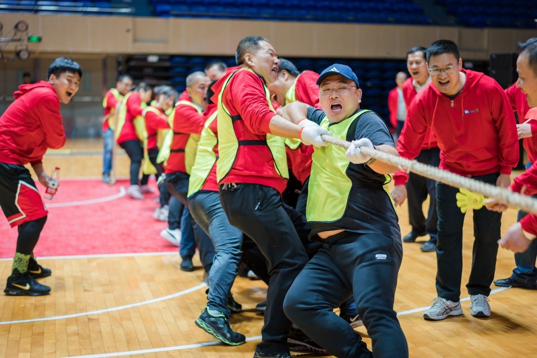 下午2點,奧體中心多功能體育館,管理聯隊、財務票務隊、分銷一隊、分銷二隊、物流中心隊、快樂人壽天隊,六支員工團隊群情振奮,士氣高亢,口號震天。比賽設置了拔河比賽、定點投籃、羽毛球發球、巨人腳步、協力闖關五個趣味運動項目。每隊均派出了精兵強將,征戰賽場。